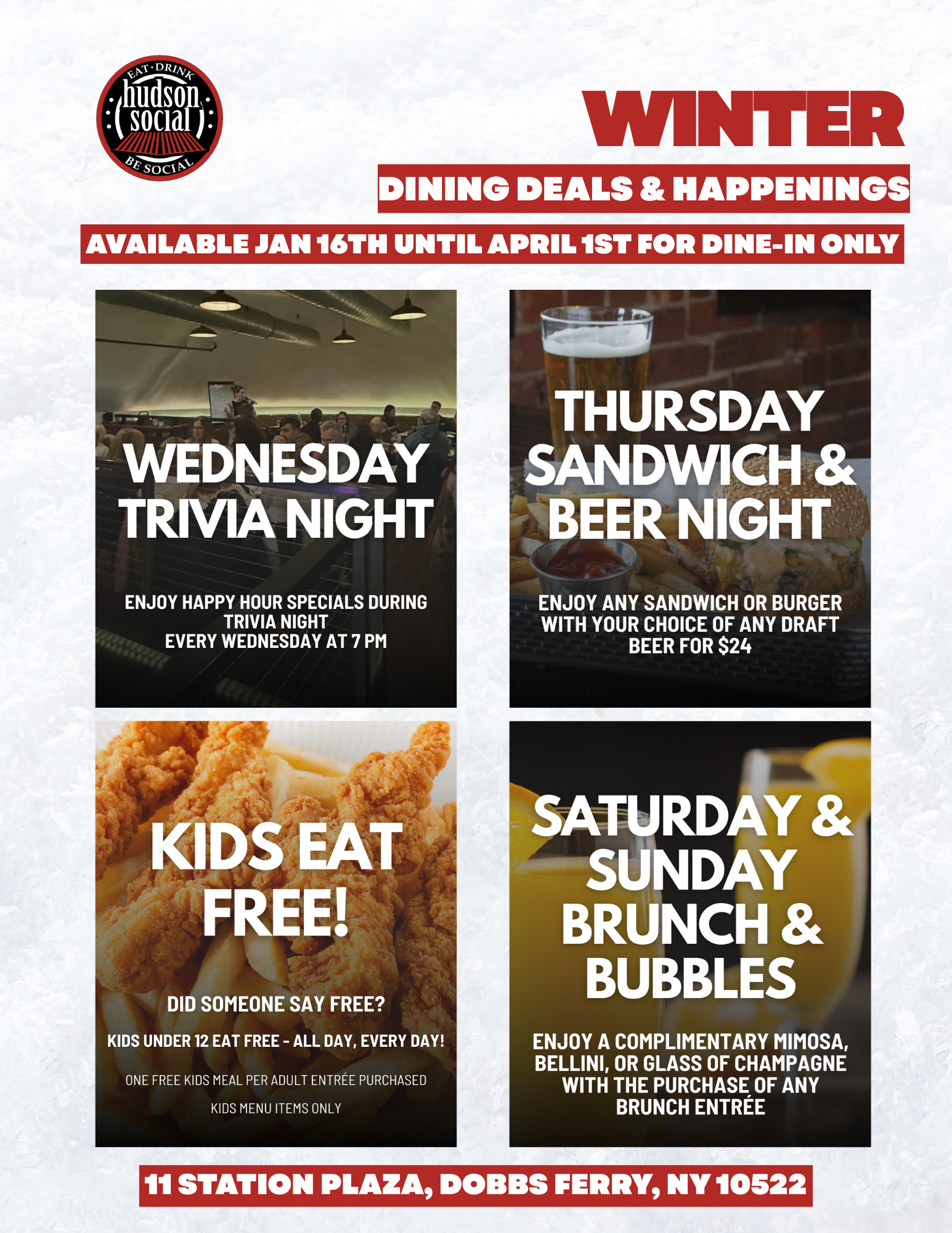 If you are looking to enjoy the beautiful Dobbs Ferry waterfront, host a special event, or you are taking the train up from or to Manhattan, Hudson Social is the perfect stop for great food and drinks. Located in the Historic Dobbs Ferry train station house, we offer a cozy and welcoming dining experience.